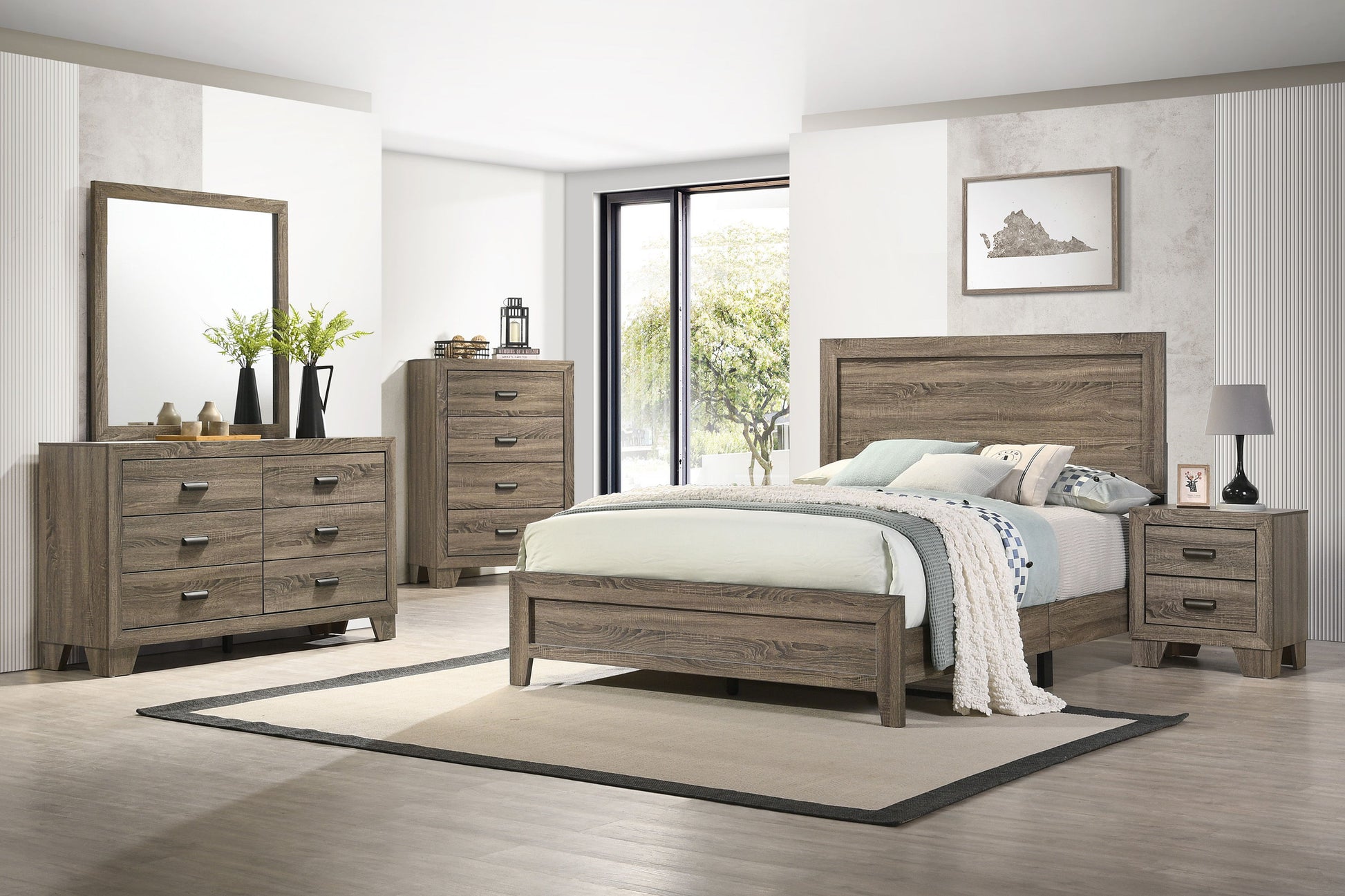 This bedroom set offers a minimalist design with a nod to rustic aesthetics, perfect for creating a serene and uncluttered space. The straightforward lines of the bed frame, combined with the natural wood finish, exude a sense of calm and earthiness. The accompanying pieces, including a simple dresser with a matching mirror, a functional chest, and a streamlined nightstand, are all characterized by their clean profiles and understated hardware. This collection is designed for practicality and durability, with ample storage options that cater to a hassle-free, organized lifestyle.