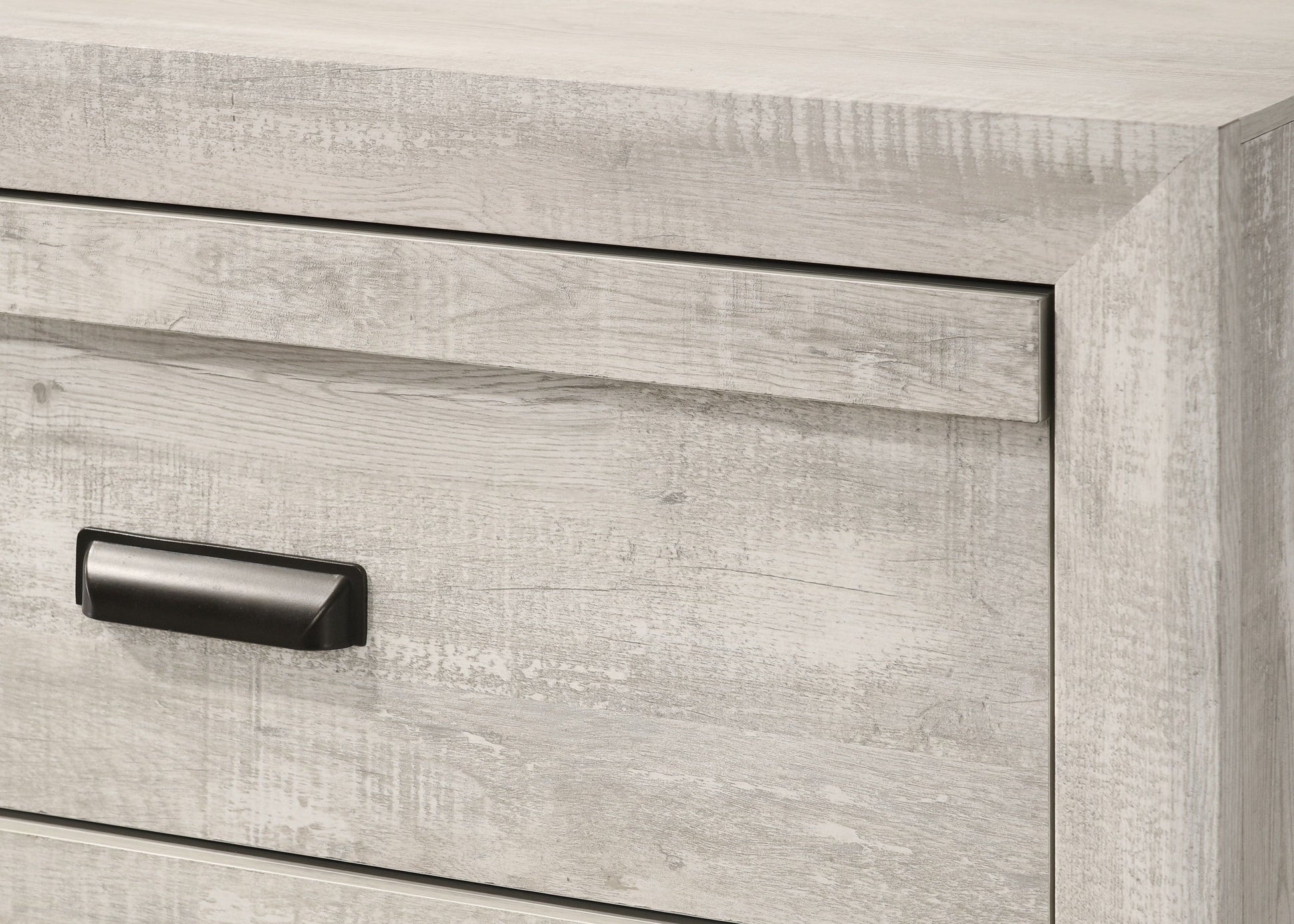 This bedroom collection encapsulates a blend of contemporary design and rustic charm. The centerpiece, a bed with a distinguished chevron patterned headboard, evokes a sense of craftsmanship and texture, infusing the space with character. Flanking the bed are matching pieces, each exhibiting clean lines and a finish that suggests a lived-in elegance. The dresser, complemented by a substantial mirror, along with the tall chest, offer ample storage solutions with understated metal handles that enhance the modern farmhouse aesthetic. A nightstand completes the set, its compact design making it a practical addition to the suite.